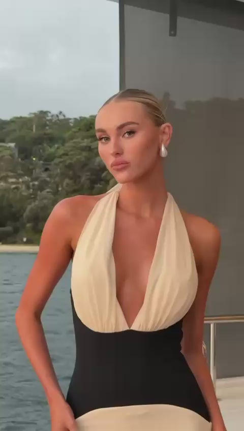 Step into timeless sophistication with The Bianca Halter Maxi Dress, a statement piece designed for sunset soirées, yacht events, and glamorous evenings. This striking two-tone gown features a plunging champagne halter neckline that drapes gracefully over the bust, contrasted by a sculpting black waist panel that cinches and defines your figure.
