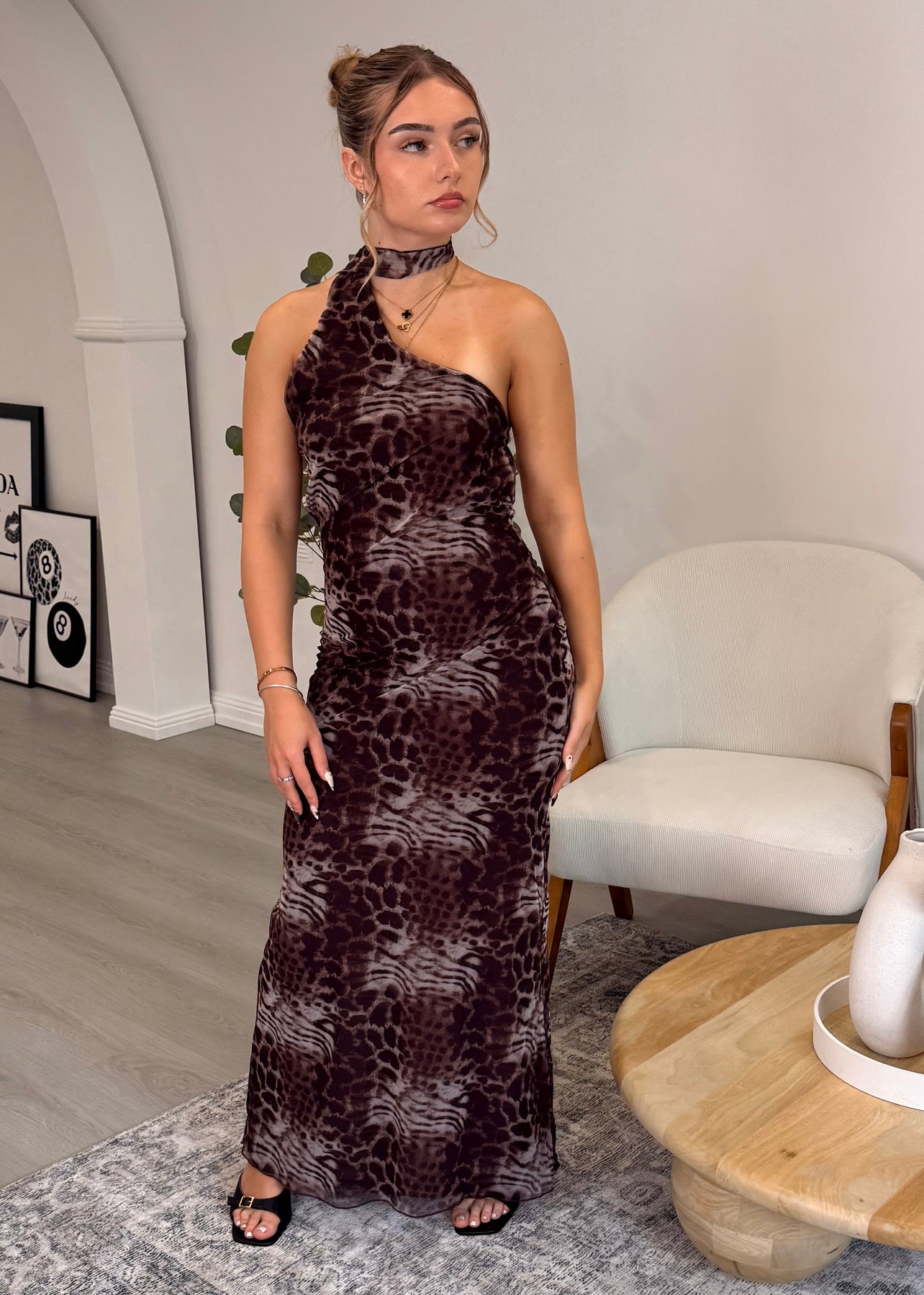 This brown asymmetrical maxi features a striking one-shoulder neckline, a soft sculpting stretch, and a dramatic open-back tie detail that creates a silhouette you’ll feel confident in from every angle.