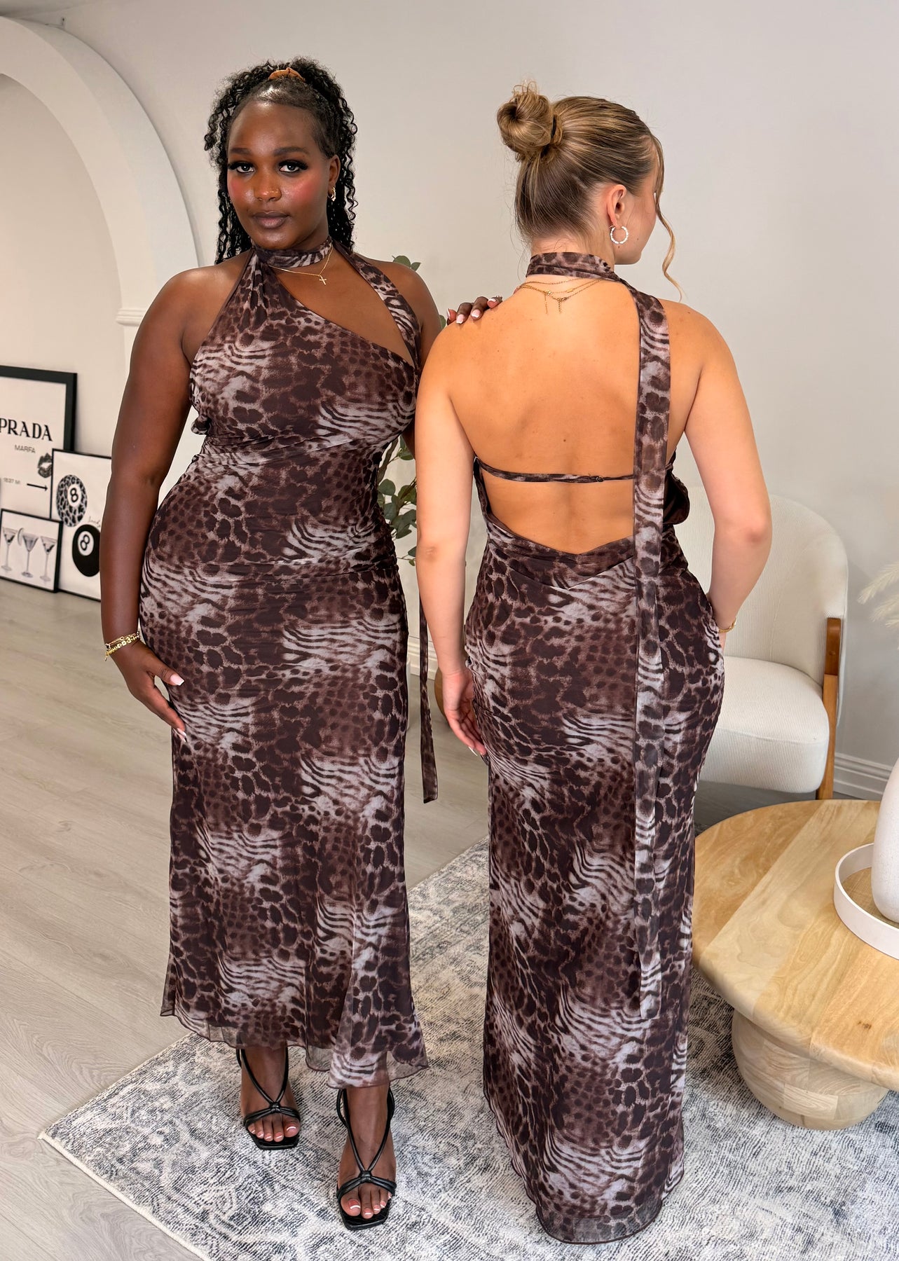 Zahara Dress – Brown Asymmetrical Backless Maxi